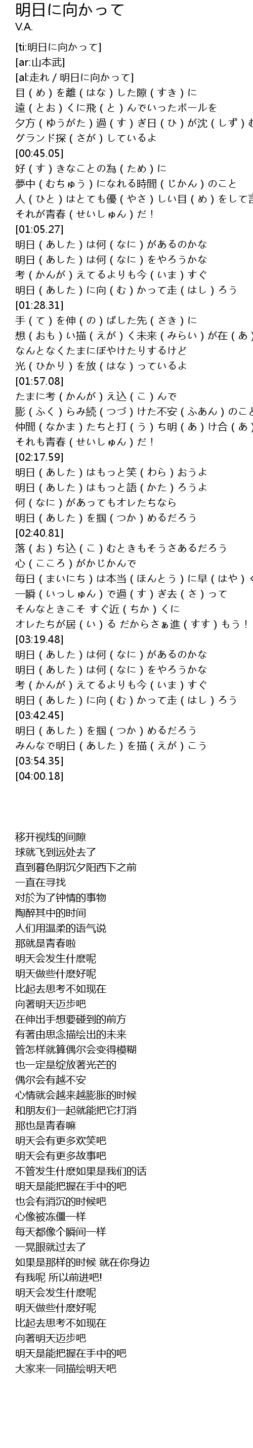 | [03:37.66] | 明日(あした)に向(む)かって走(はし)ろう |