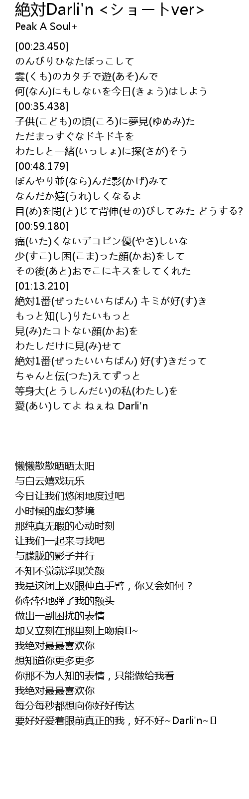 | [01:13.760] | 絶対1番(ぜったいいちばん) キミが好(す)き |