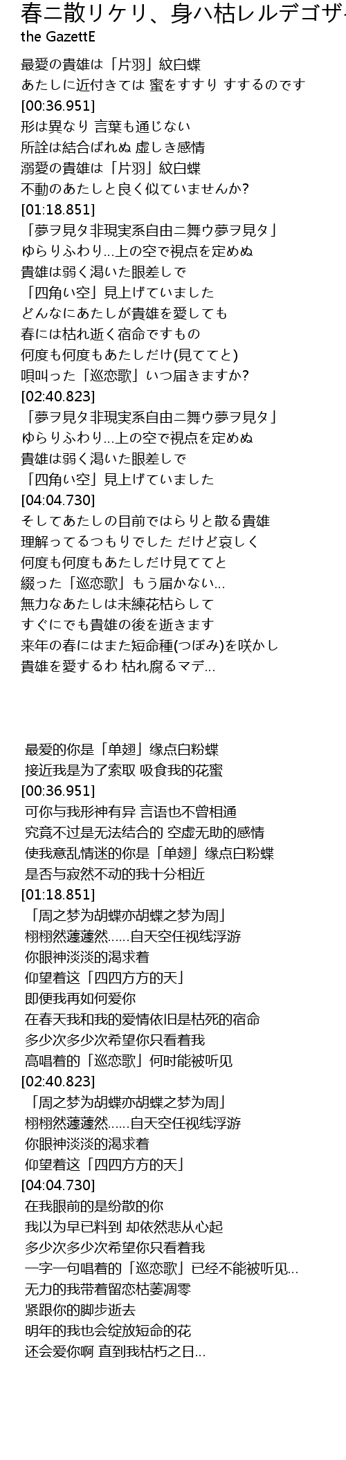 | Song | 春ニ散リケリ、身ハ枯レルデゴザイマス |