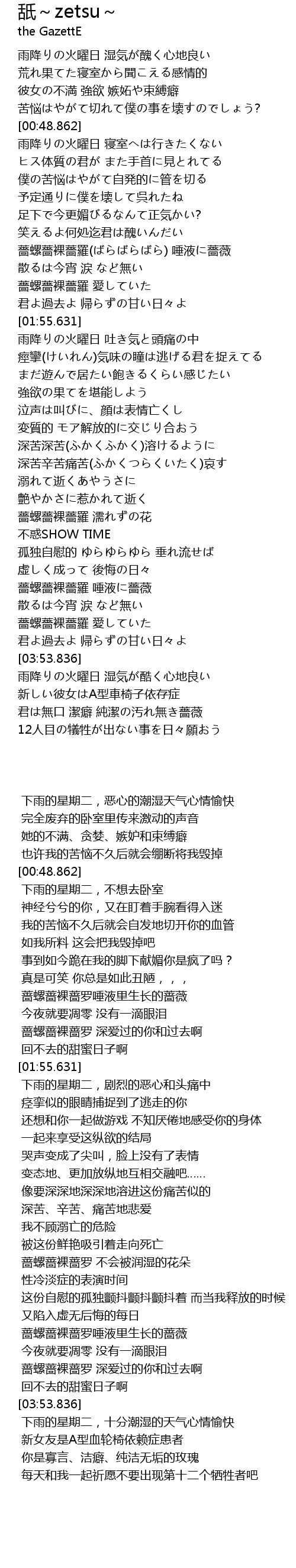 | [01:35.752] | 薔螺薔裸薔羅(ばらばらばら) 唾液に薔薇 |