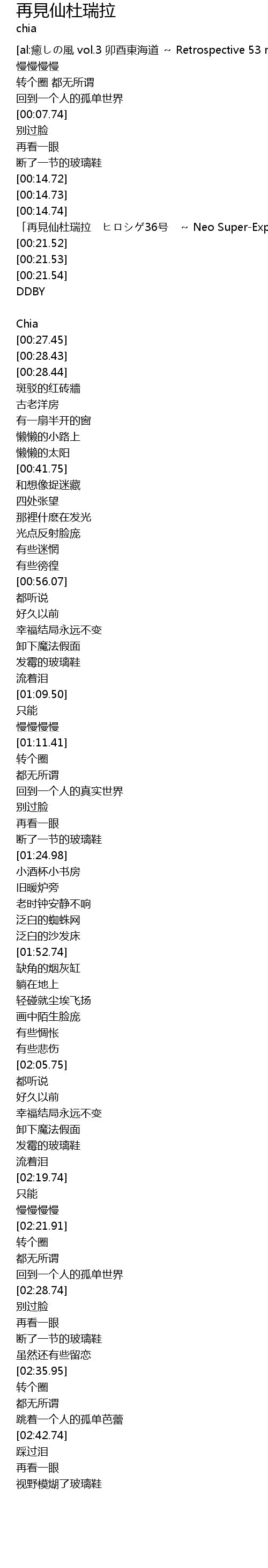 | [00:14.75] | 「再見仙杜瑞拉 ヒロシゲ36号 ~ Neo Super-Express」 |