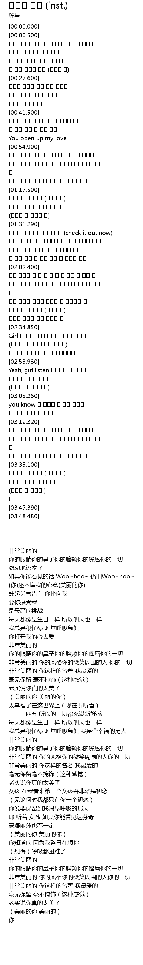 | [03:27.670] | 너무 예쁘다 너라는 명작을 난 사랑하는 걸 |