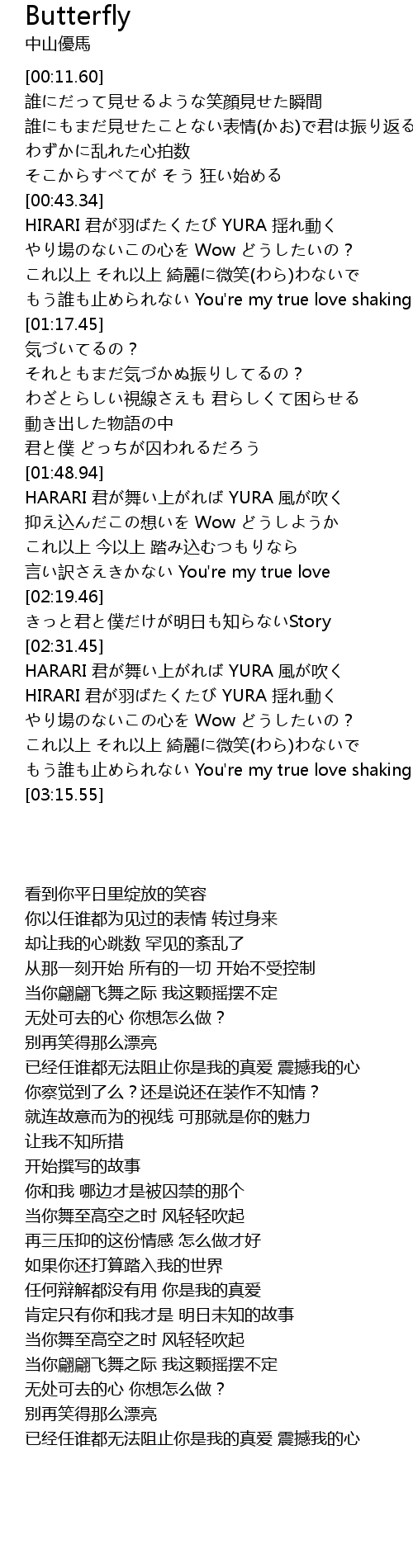 | [00:44.15] | HIRARI 君が羽ばたくたび YURA 揺れ動く |
