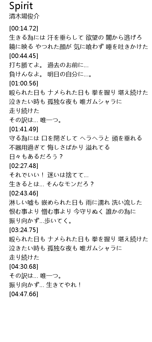 | [01:03.58] | 殴られた日も ナメられた日も 拳を握り 堪え続けた |