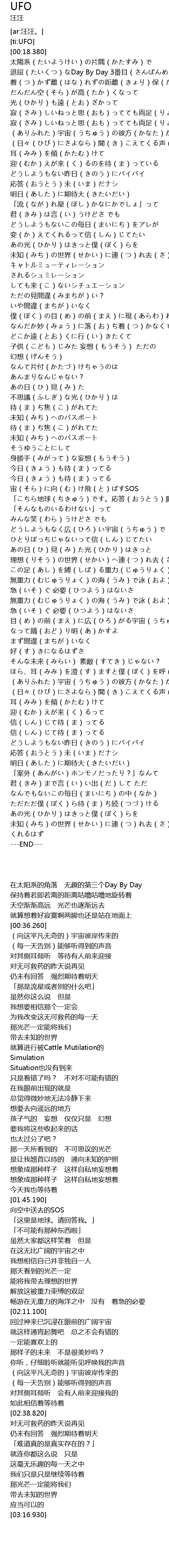 | [00:21.180] | 太陽系(たいようけい)の片隅(かたすみ)で 退屈(たいくつ)なDay By Day 3番目(さんばんめ) |