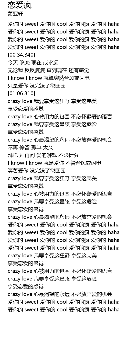 | [02:35.600] | 爱你的 sweet 爱你的 cool 爱你的疯 爱你的 haha |