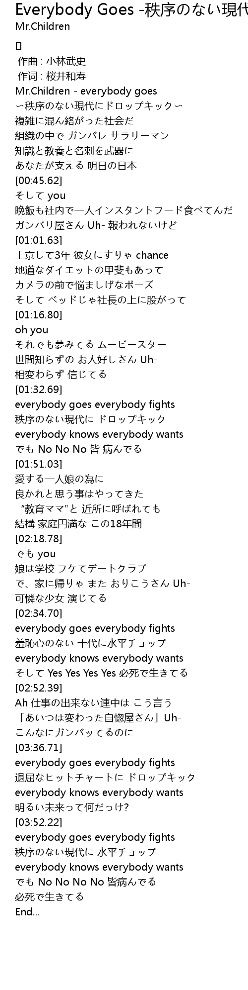 | [00:00.00] | Mr.Children - everybody goes 〜秩序のない現代にドロップキック〜 |