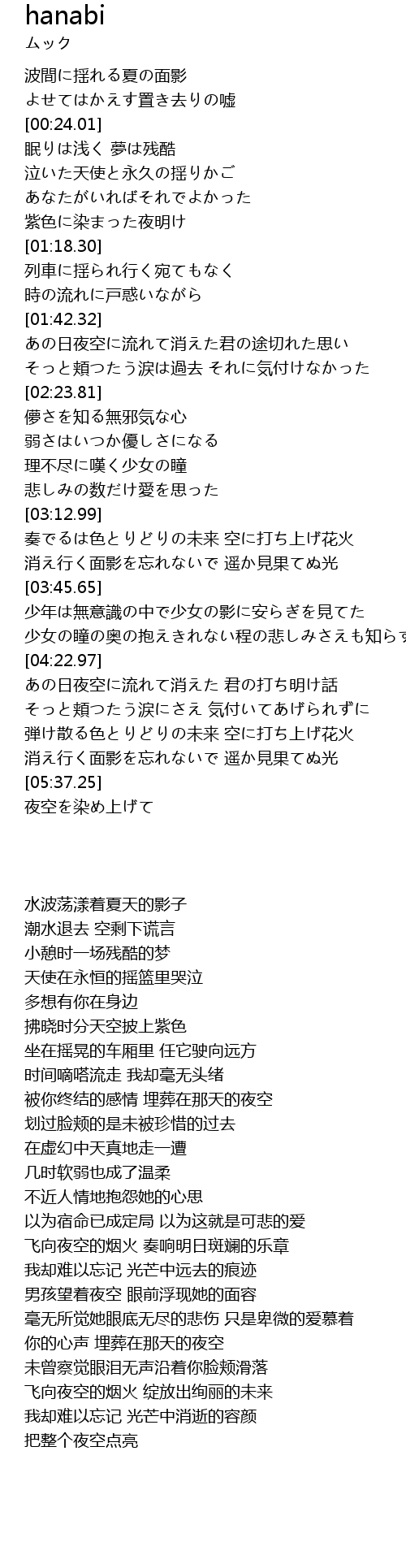 | [05:04.90] | 弾け散る色とりどりの未来 空に打ち上げ花火 |
