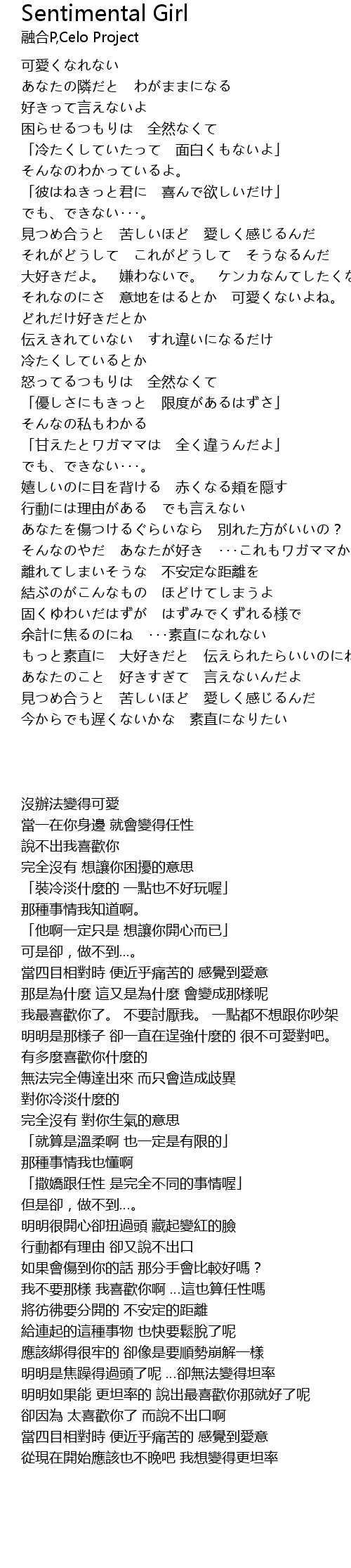 | [01:15.90] | それなのにさ 意地をはるとか 可愛くないよね。 |