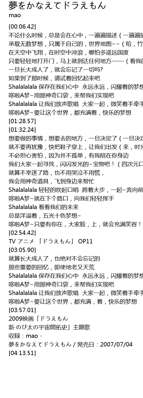 | [04:06.01] | 収録:mao - 夢をかなえてドラえもん/発売日:2007/07/04 |