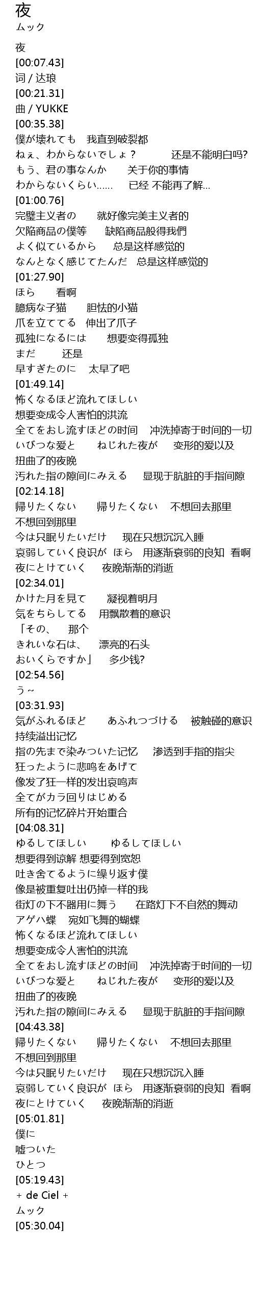 | [02:05.27] | いびつな爱と ねじれた夜が 变形的爱以及 扭曲了的夜晚 |