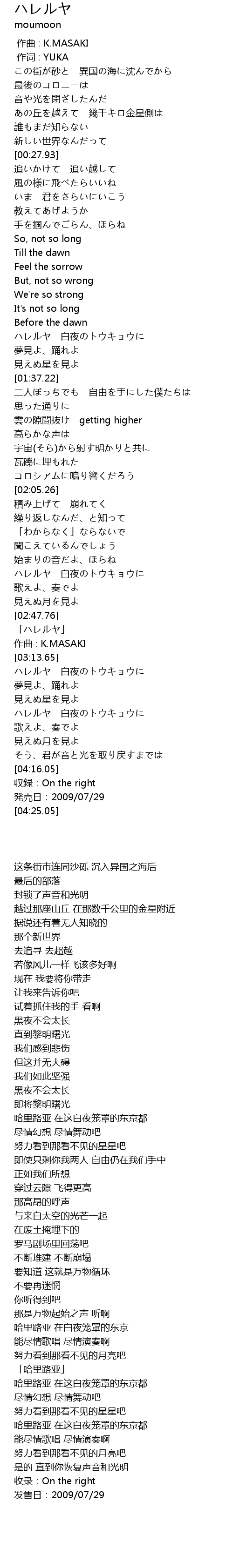 | [03:42.22] | ハレルヤ 白夜のトウキョウに |