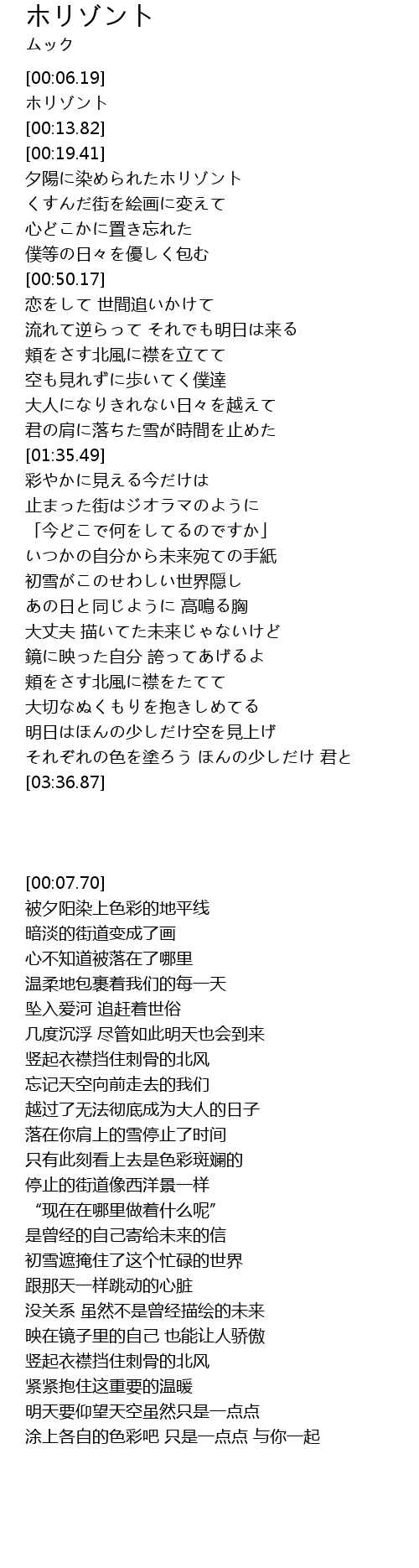 | [00:21.67] | 夕陽に染められたホリゾント |