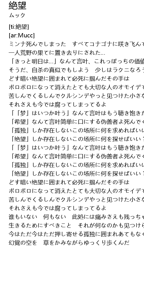 | [01:23.499] | 「きっと明日は…」なんて言叶、これっぽっちの価値もないゴミ |
