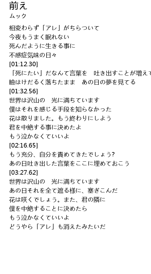 | [03:38.30] | あの日それを全て遮る様に、塞ぎこんだ |