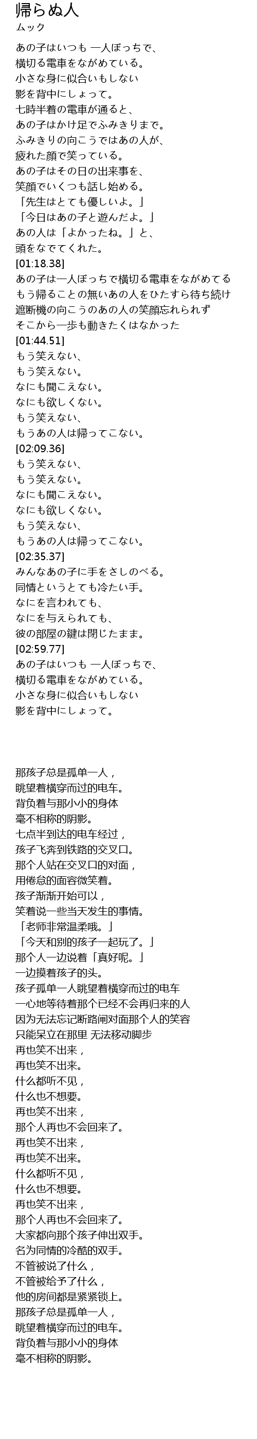 | [01:26.85] | もう帰ることの無いあの人をひたすら待ち続け |