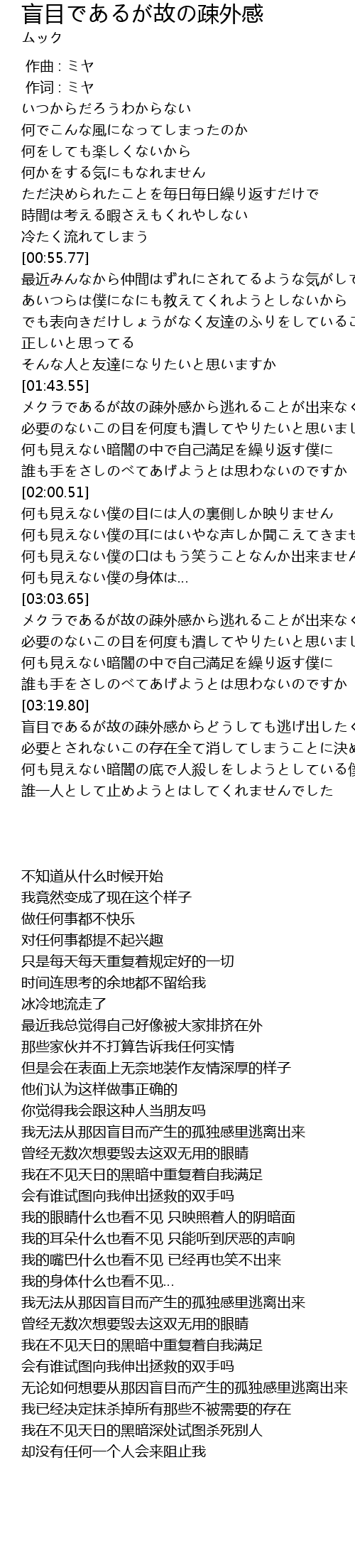 | [01:43.79] | メクラであるが故の疎外感から逃れることが出来なくて |
