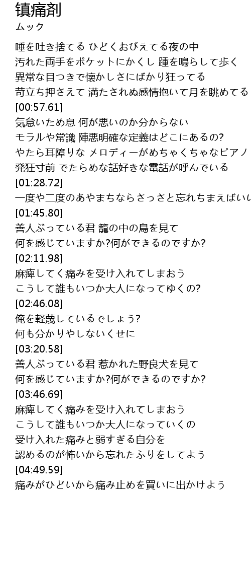 | [05:06.73] | 痛みがひどいから痛み止めを買いに出かけよう |