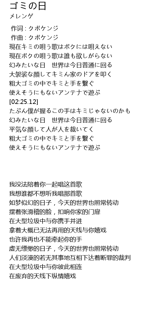 | [02:03.88] | 粗大ゴミの中でキミと手を繋ぐ |