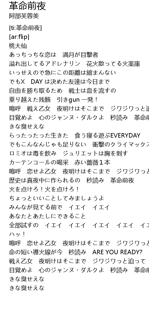 | [01:46.518] | 歴史は真夜中に作られるの 秒読み 革命前夜 |