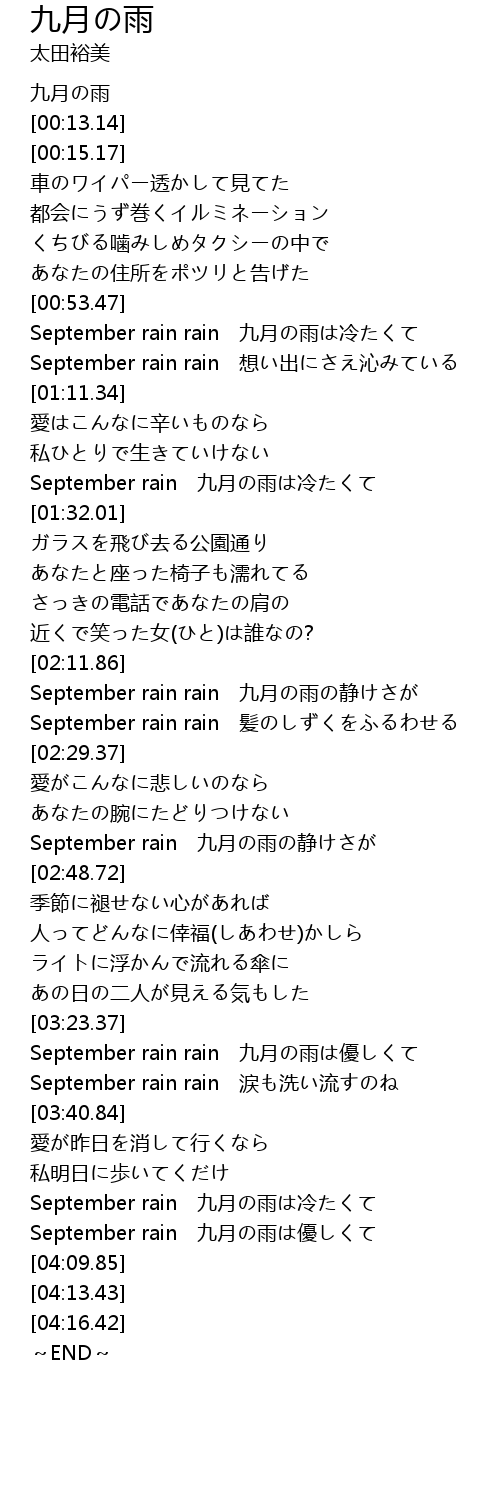 | [03:32.61] | September rain rain 涙も洗い流すのね |