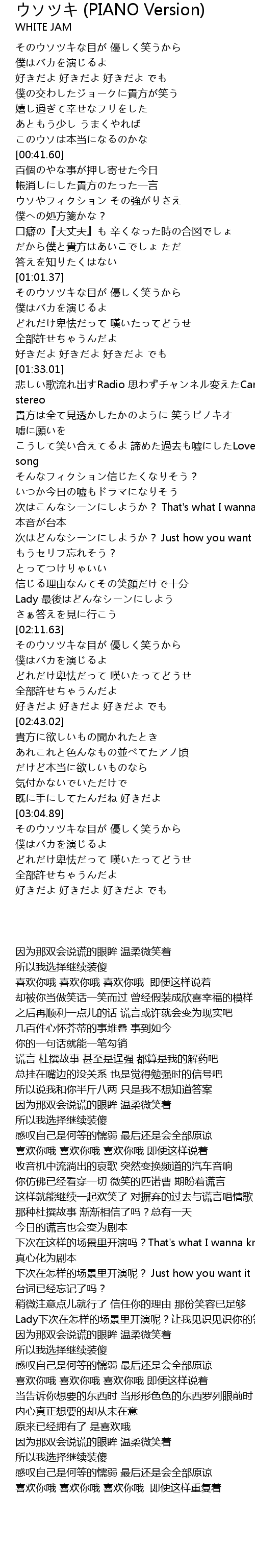 | [03:14.56] | そのウソツキな目が 優しく笑うから 僕はバカを演じるよ |
