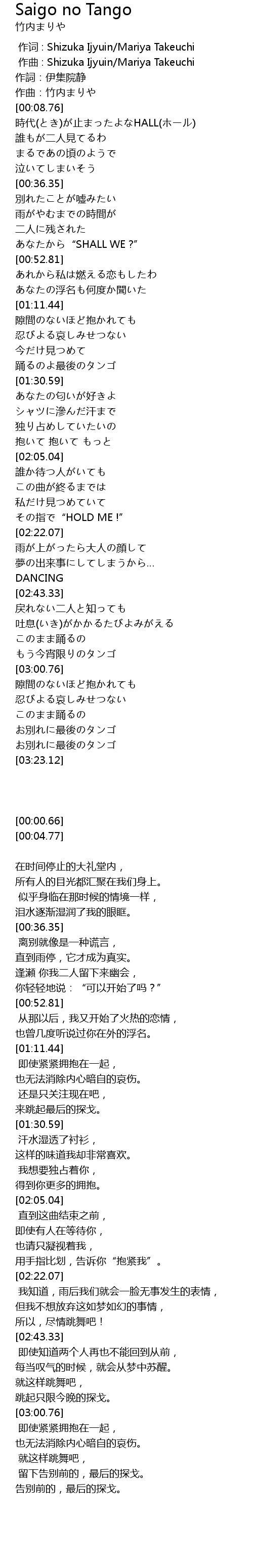| [01:25.46] | 踊るのよ最後のタンゴ |