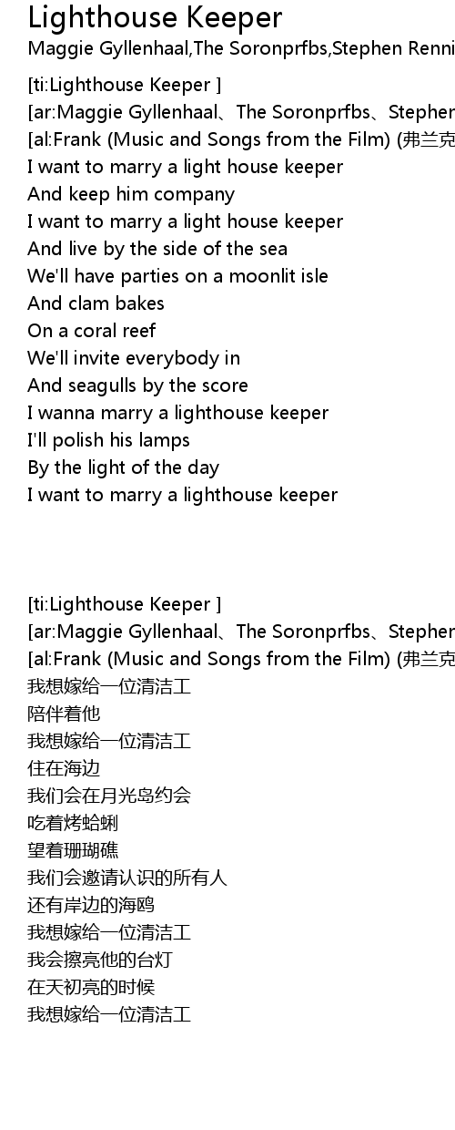 | [00:25.63] | I want to marry a light house keeper |