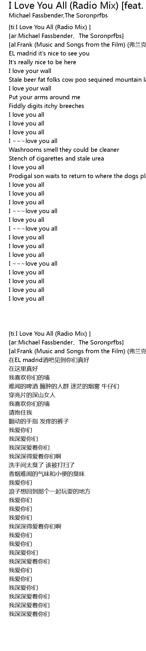 | Song | I Love You All (Radio Mix) [feat. Michael Fassbender] |