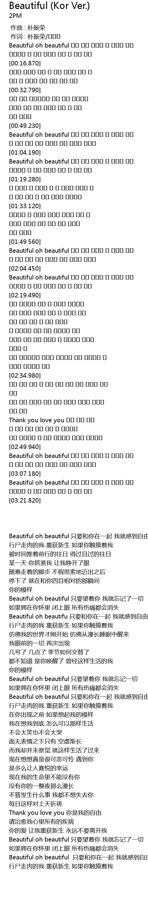 | [02:51.930] | Beautiful oh beautiful 너를 보고 있으면 난 모든걸 잊어 |