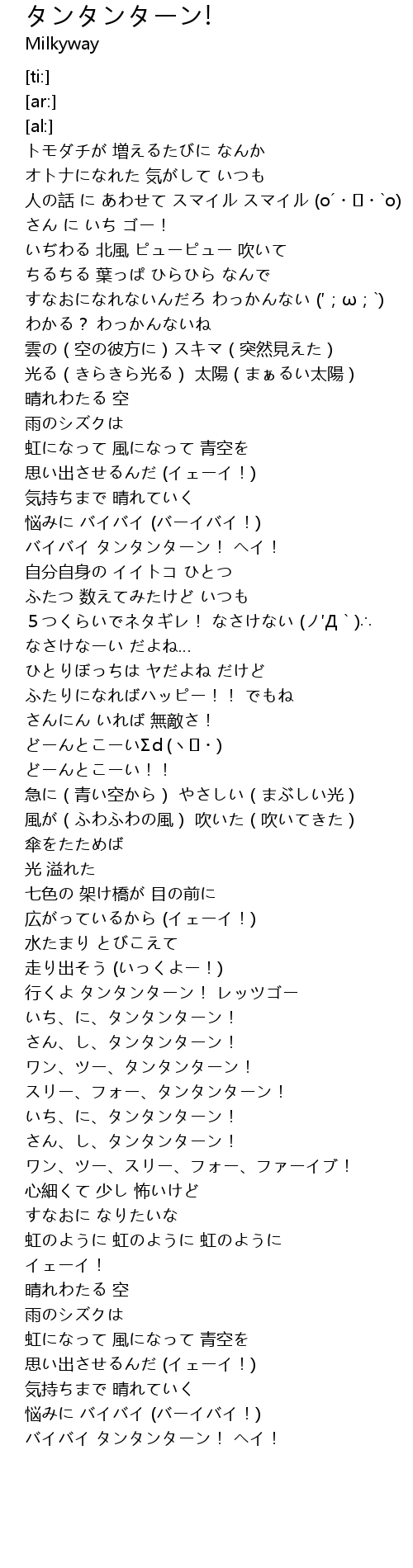 | [02:41.76] | 行くよ タンタンターン! レッツゴー |