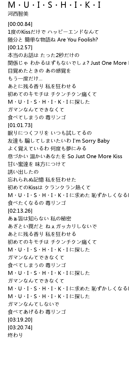 | [01:59.46] | M・U・I・S・H・I・K・I に求めた 恥ずかしくなるほど |