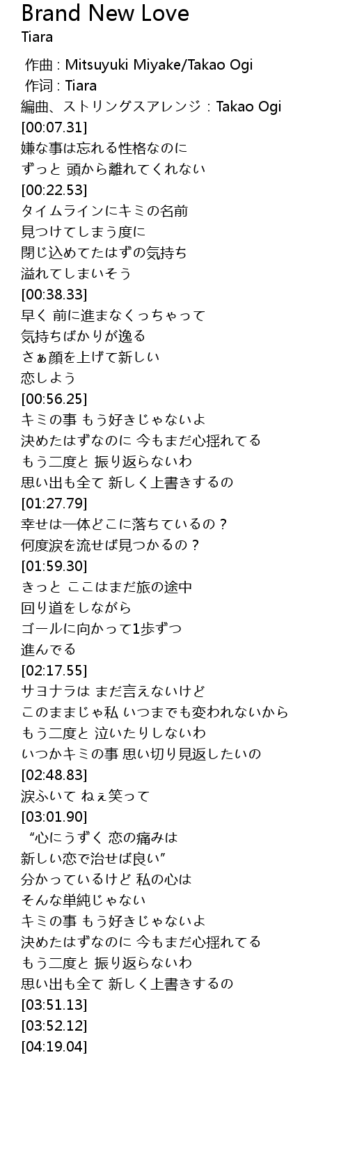 | [00:05.01] | 編曲、ストリングスアレンジ:Takao Ogi |
