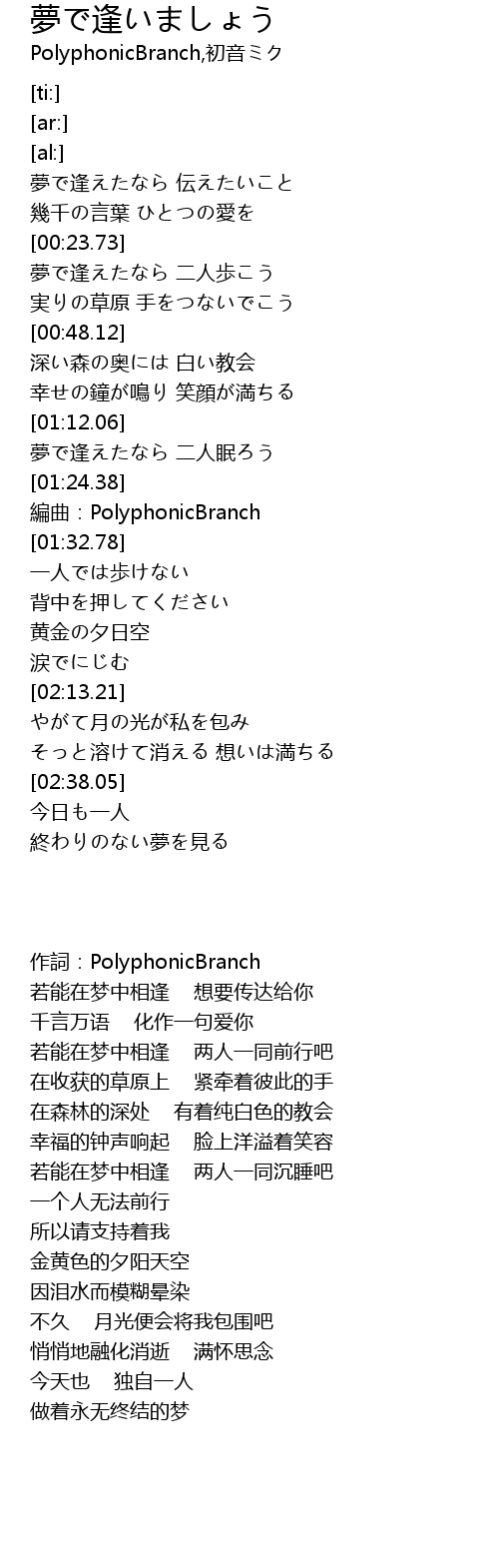 | [01:13.60] | 夢で逢えたなら 二人眠ろう |