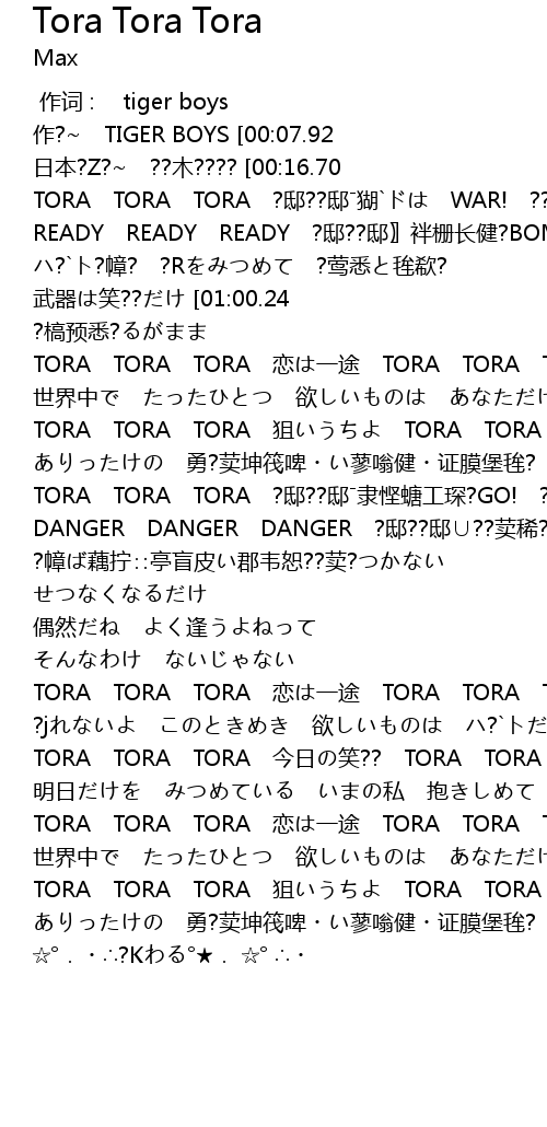 | [00:01.47]作?~ TIGER BOYS [00:07.92]作曲 TIGER BOYS [00:12.99]日本?Z?~ ??木???? [00:16.70]?h MAX [00:41.02]TORA TORA TORA ?邸??邸ˉ猢`ドは WAR! ??悟してね [00:47.37]READY READY READY ?邸??邸〗袢栅长健?BOMB! 想い遂げる [00:53.87]ハ?`ト?幛? ?Rをみつめて ?莺悉と毪欷? [00:58.48]武器は笑??だけ [01:00.24]きっと云える きっと叶う [01:03.29]?槁预悉?るがまま [01:06.61]TORA TORA TORA 恋は一途 TORA TORA TORA ホンキよ [01:12.95]世界中で たったひとつ 欲しいものは あなただけ [01:19.25]TORA TORA TORA 狙いうちよ TORA TORA TORA ?儇?よ [01:25.61]ありったけの 勇?荬坤筏啤・い蓼嗡健・证膜堡毪? [01:44.62]TORA TORA TORA ?邸??邸ˉ隶悭螗工琛?GO! ?lもみてない [01:51.00]DANGER DANGER DANGER ?邸??邸∪??荬稀?BOMB! 消してしまえ [01:57.78]?幛ば藕拧∷亭盲皮い郡韦恕??荬?つかない [02:02.28]せつなくなるだけ [02:04.16]偶然だね よく逢うよねって [02:07.39]そんなわけ ないじゃない [02:10.53]TORA TORA TORA 恋は一途 TORA TORA TORA いつでも [02:16.79]?jれないよ このときめき 欲しいものは ハ?`トだけ [02:23.22]TORA TORA TORA 今日の笑?? TORA TORA TORA ??けるよ [02:29.48]明日だけを みつめている いまの私 抱きしめて [02:48.59]TORA TORA TORA 恋は一途 TORA TORA TORA ホンキよ [02:54.89]世界中で たったひとつ 欲しいものは あなただけ [03:01.29]TORA TORA TORA 狙いうちよ TORA TORA TORA ?儇?よ [03:07.59]ありったけの 勇?荬坤筏啤・い蓼嗡健・证膜堡毪? [03:46.32] | ? K |