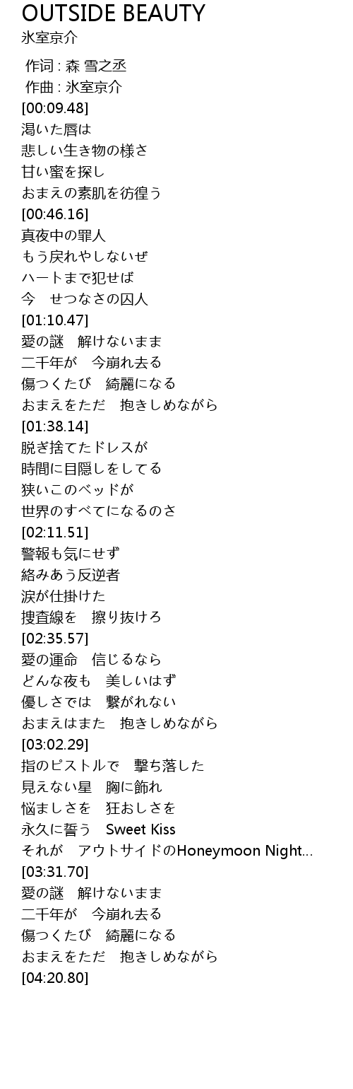 | [03:25.52] | それが アウトサイドのHoneymoon Night… |