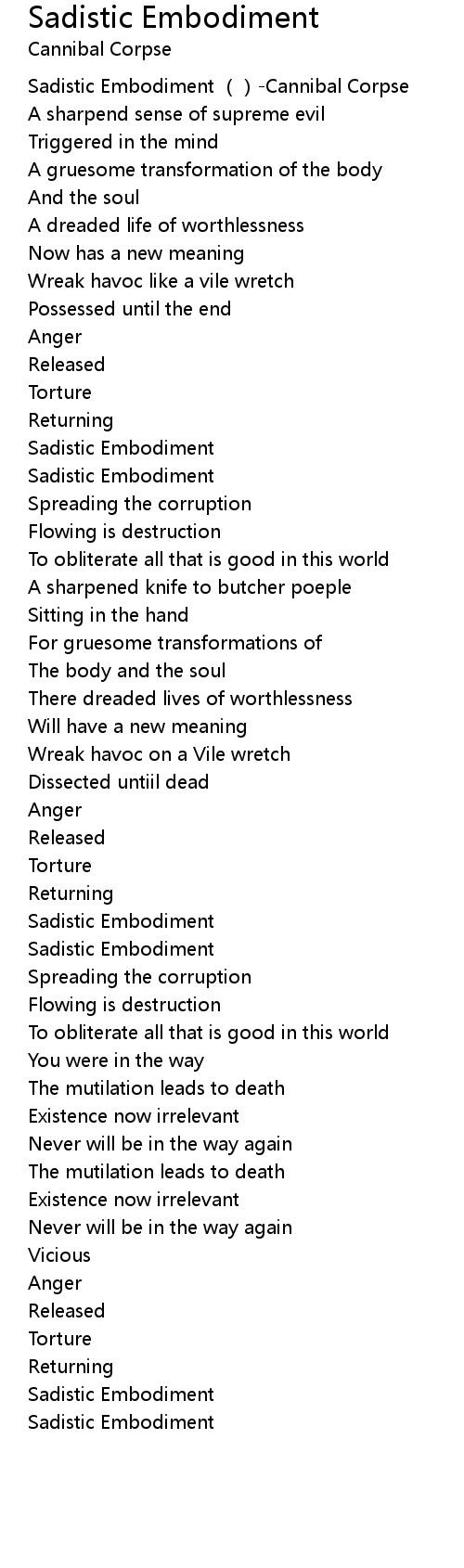 | [00:00.00] | Sadistic Embodiment ()-Cannibal Corpse |