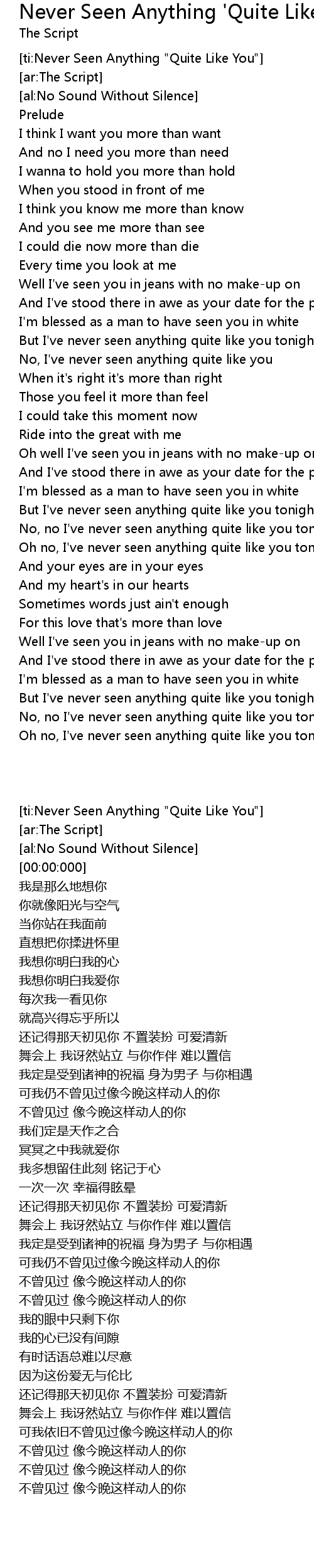 [ti:Never Seen Anything "Quite Like You"] |