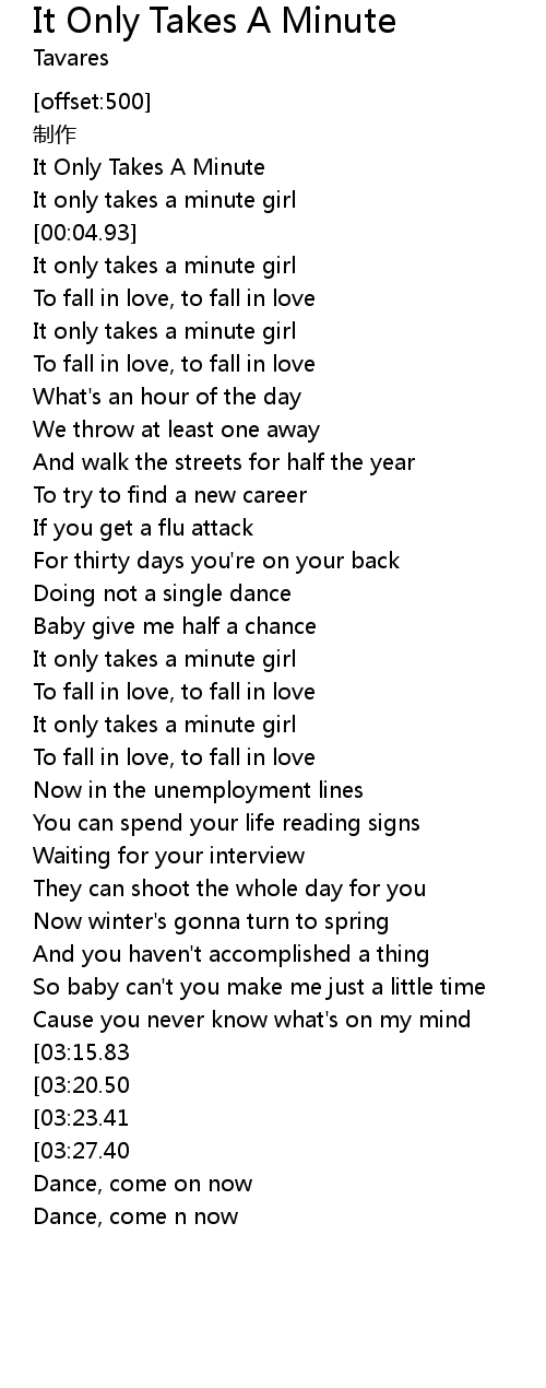| [03:31.19][03:15.83][03:00.40][02:06.75] | It only takes a minute girl |