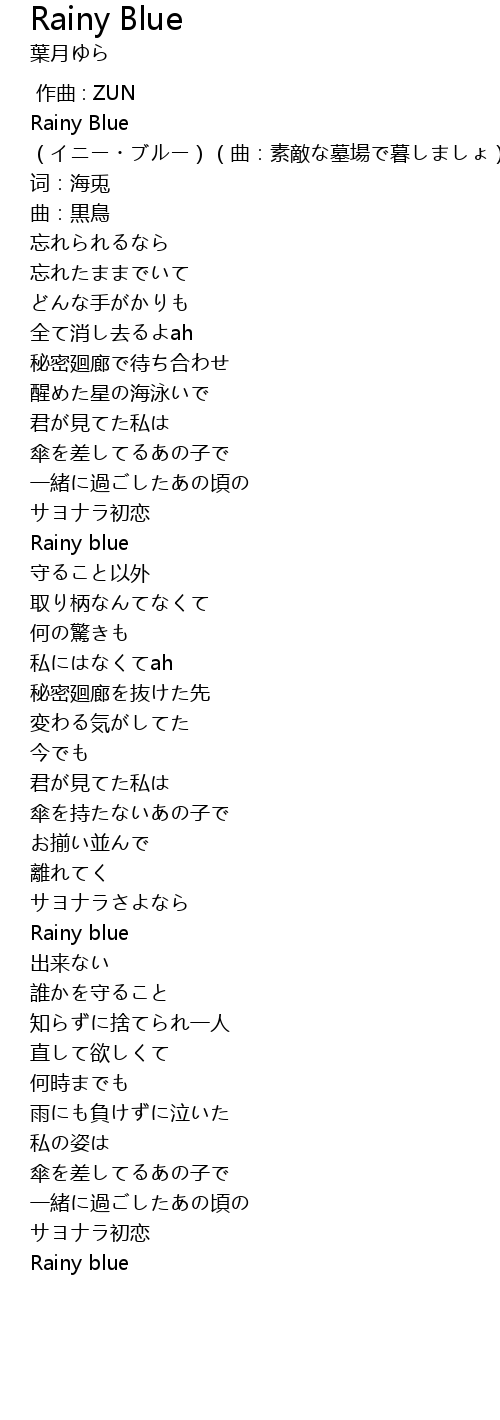 | [00:00.00] | Rainy Blue (イニー・ブルー)(曲:素敵な墓場で暮しましょ)-葉月ゆら(月由罗) |