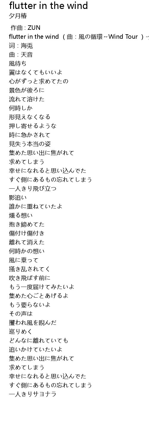 | [00:00.00] | flutter in the wind (曲:風の循環~Wind Tour )-夕月椿 |