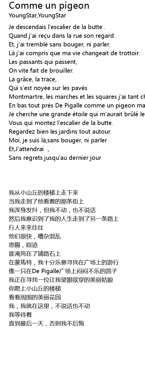 | [00:56.600] | En bas tout pre s De Pigalle comme un pigeon malheureux |