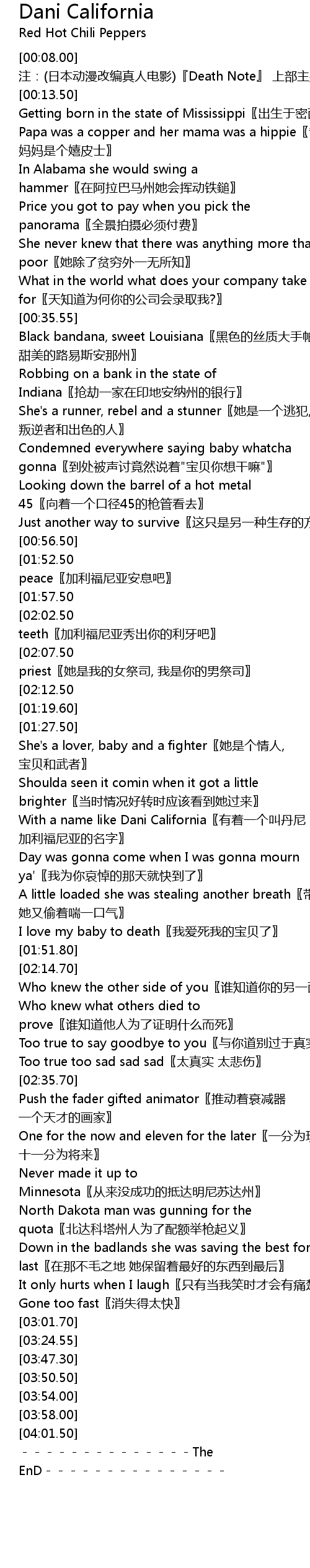 | [01:36.87] | With a name like Dani California yǒu zhe yí gè jiào dān ní jiā lì fú ní yà de míng zì |