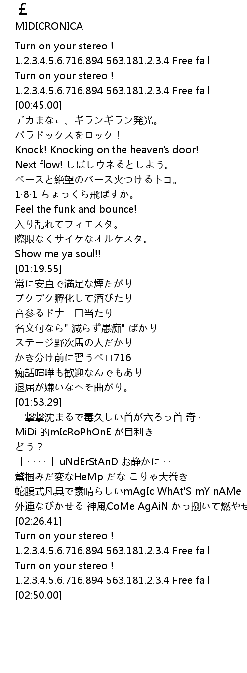 | [02:18.56] | 蛇腹式凡具で素晴らしいmAgIc WhAt'S mY nAMe ? 894 ! |