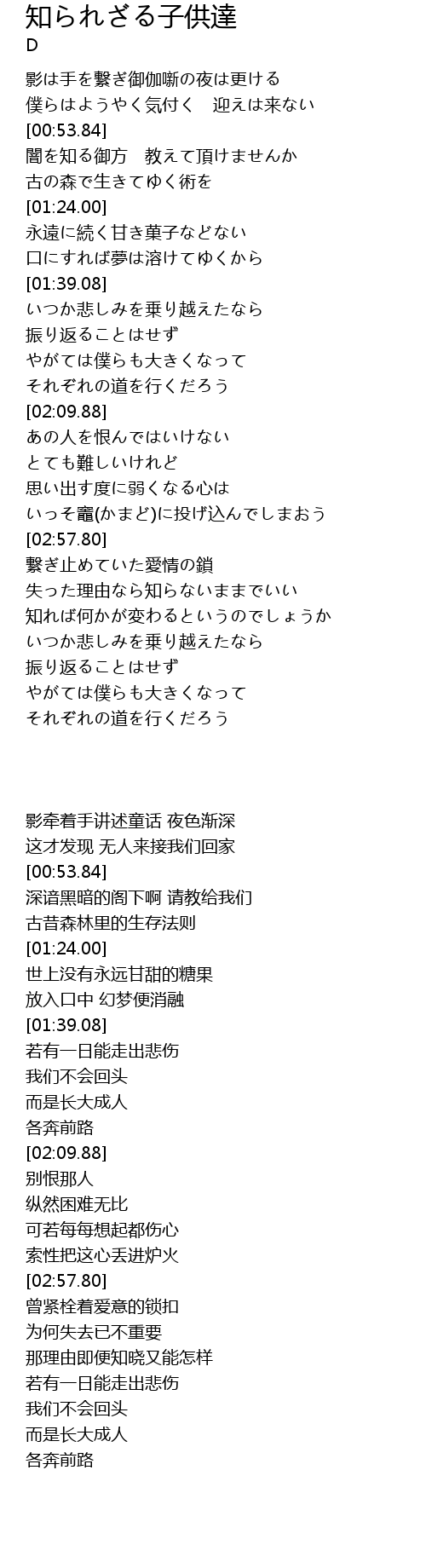 | [00:24.57] | 影は手を繋ぎ御伽噺の夜は更ける |