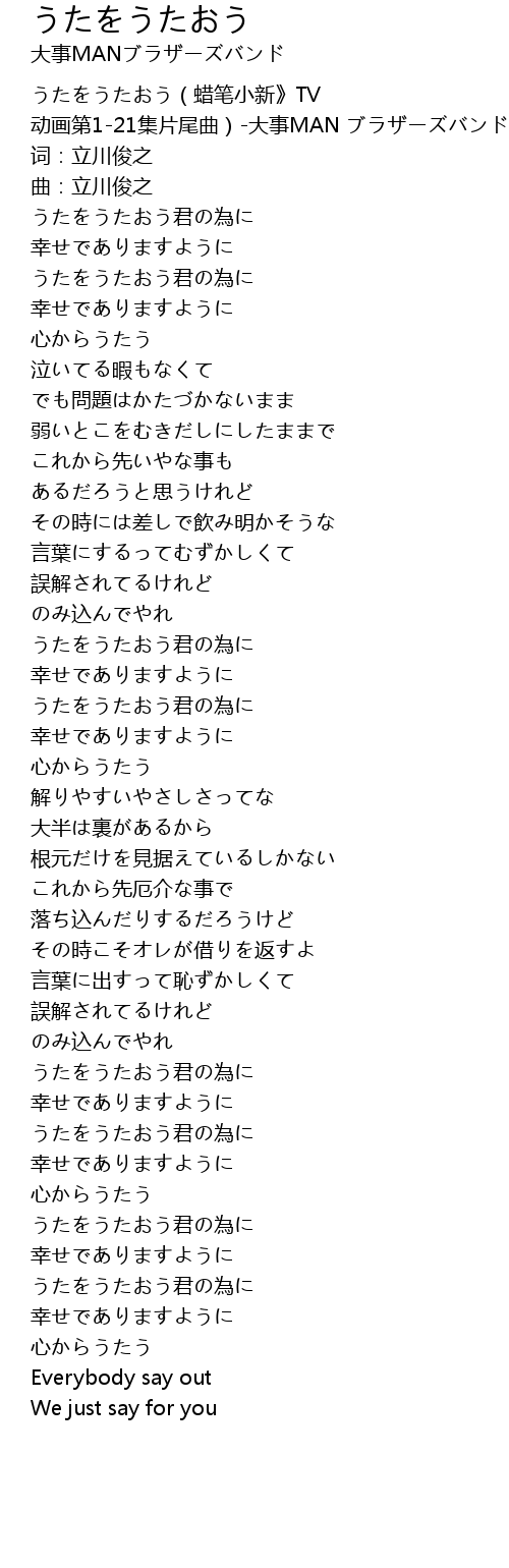 | [00:00.00] | うたをうたおう(蜡笔小新》TV 动画第1-21集片尾曲)-大事MAN ブラザーズバンド |