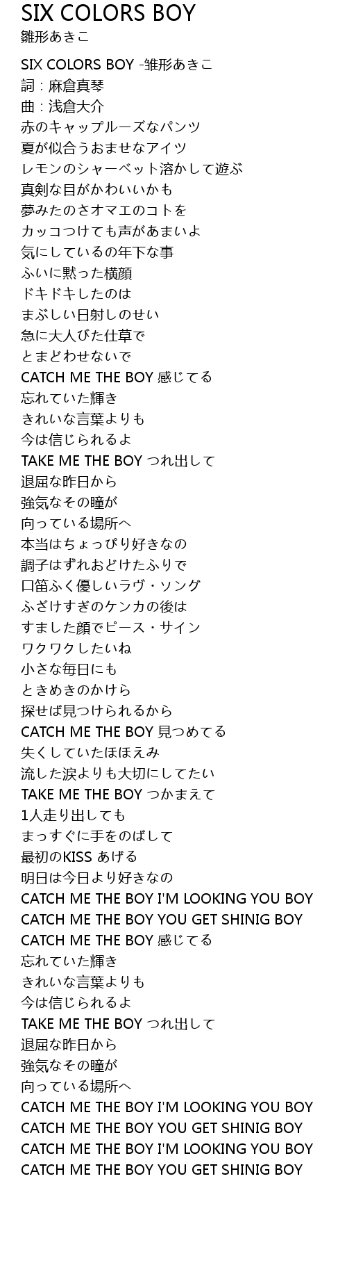 | [00:00.740] | SIX COLORS BOY -雏形あきこ |