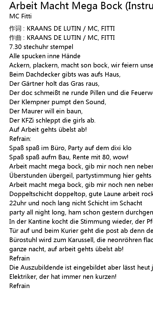 | In der Kantine kocht die Stimmung wieder, der Pf rtner macht heut nacht die Tü r auf und beim Kurier geht die post ab denn der chef ist zuhaus. Der Bü rostuhl wird zum Karussell, die neonr hren flackern hell, konfidisco die ganze nacht, auf arbeit gehts ü belst ab! | |