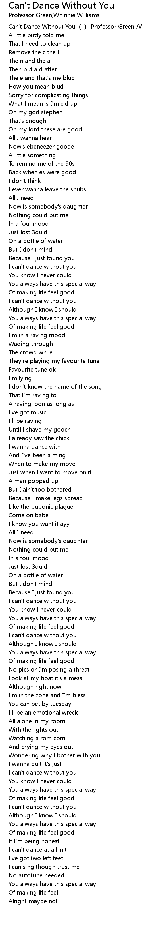 | [00:00.00] | Can' t Dance Without You Professor Green Whinnie Williams |