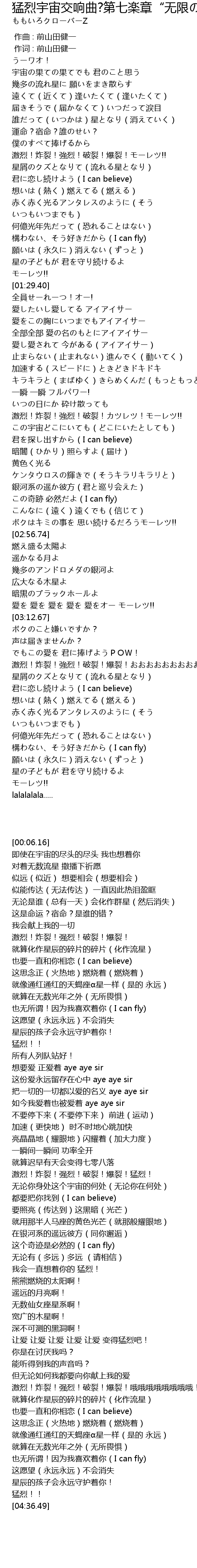 | [03:42.68] | 激烈!炸裂!強烈!破裂!爆裂!おおおおおおおおおおお!モーレツ!!!!! |